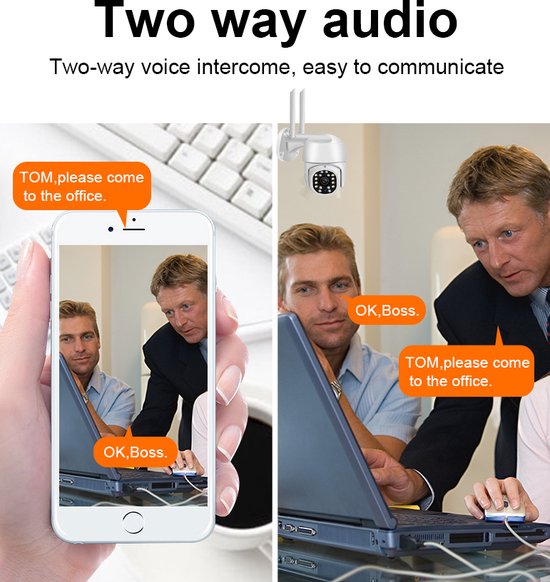 - Détection intelligente des mouvements et audio à 2 canaux avec microphone et haut-parleur. Lorsque la caméra intelligente détecte quelqu'un qui s'approche de votre maison, l'objectif de la caméra le suit toujours et commence à enregistrer et à télécharger sur la carte SD (enregistrement 24/7, max 128 Go, sans carte SD !), et à envoyer des notifications à votre téléphone portable. En même temps, vous pouvez envoyer une alerte par le biais d'un système audio bidirectionnel.