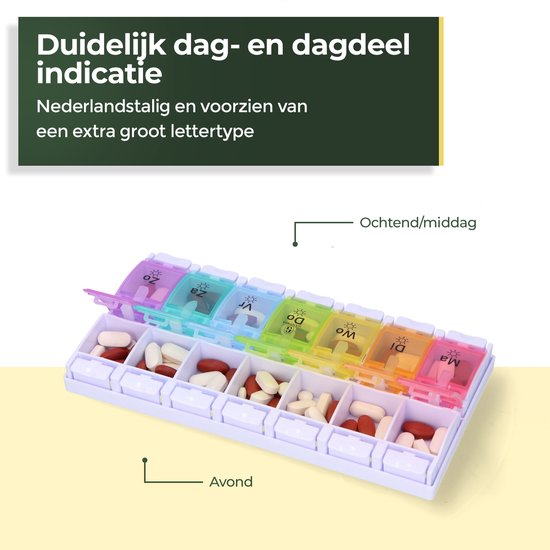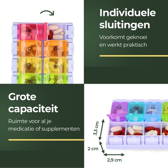 Vos médicaments ne seront plus jamais mélangés et vous ne vous tromperez plus jamais de médicament ! Grâce à la fermeture séparée des parties jour, vous êtes sûr de prendre le bon médicament sans qu'ils ne se mélangent.