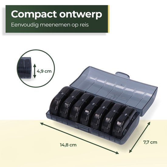 - Dimensions du pilulier : 14,8 x 7,7 x 4,9 cm