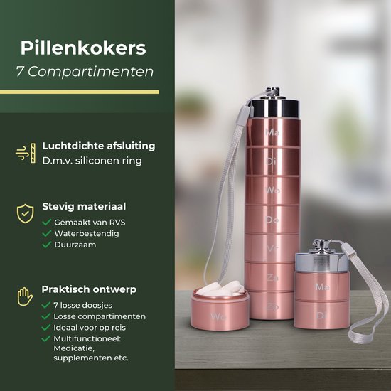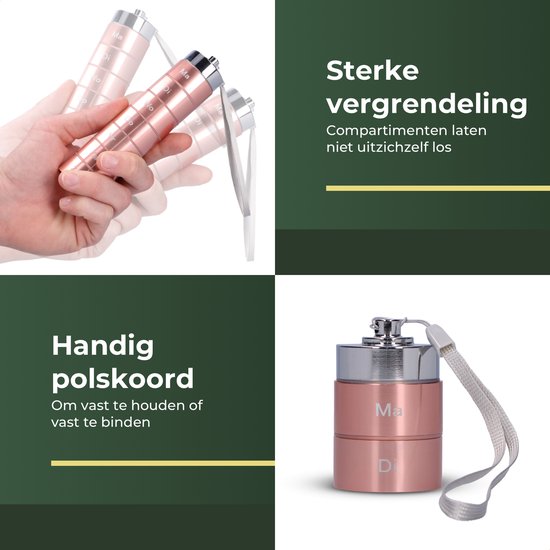 Le pilulier Gandria est fabriqué à partir de matériaux robustes, étanches à l'eau et à l'air. Cela permet non seulement de prolonger la durée de vie du pilulier, mais aussi de garantir la qualité de vos médicaments en tout temps. En outre, les compartiments spacieux peuvent accueillir des pilules de grande taille. Un pilulier n'assure pas seulement une bonne organisation et une facilité d'utilisation, mais il donne aussi l'assurance que vos médicaments restent à l'heure, ce qui est essentiel pour un mode de vie sain.