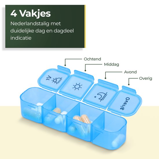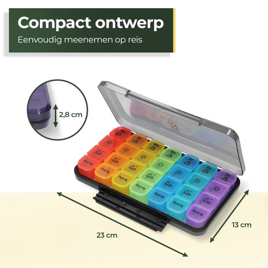 En outre, ce conteneur de médicaments comprend des boîtes de pilules amovibles pour chaque jour, ce qui facilite la prise de vos médicaments quotidiens en déplacement. Les compartiments spacieux peuvent même accueillir des pilules de grande taille. Ainsi, ce conteneur à médicaments est non seulement pratique et facile à utiliser, mais aussi rassurant car vous avez toujours vos médicaments avec vous.L'horaire reste le même, ce qui contribue à un mode de vie sain.