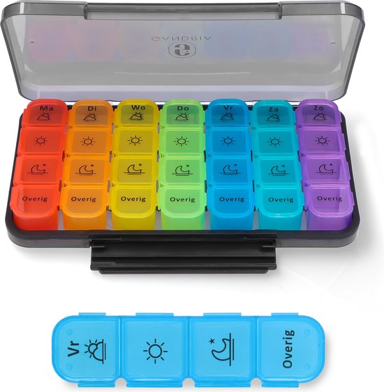 Boîte à pilules Gandria 7 jours - Boîte à pilules amovible - Boîte à médicaments avec 28 compartiments - Boîte à médicaments avec fermeture solide - 4 compartiments par jour