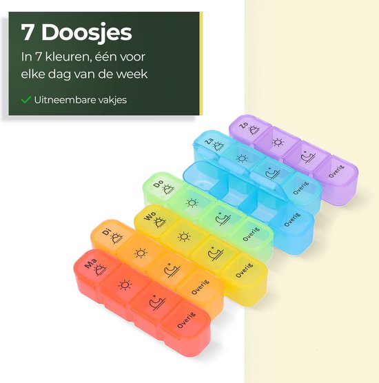 Les 7 compartiments amovibles colorés permettent de reconnaître facilement le bon jour, ce qui rend la prise de médicaments encore plus facile.