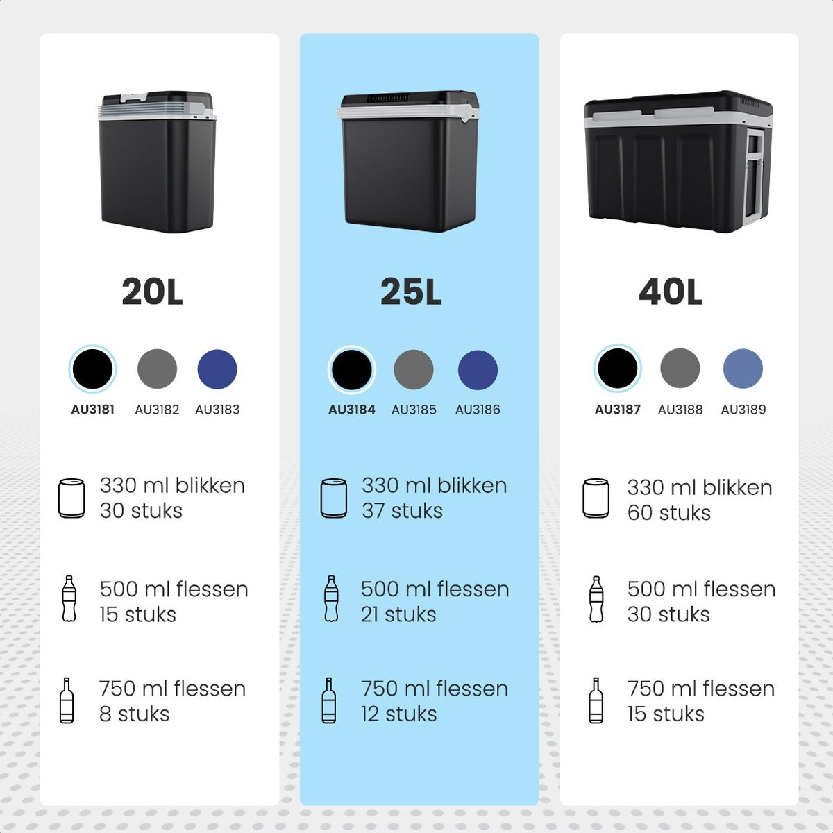 La glacière d'Auronic a une grande capacité de 25 litres. Vous disposez ainsi de suffisamment d'espace pour refroidir toutes vos boissons et tous vos en-cas préférés. La glacière est suffisamment grande pour refroidir jusqu'à 37 canettes. Elle est donc idéale pour un pique-nique ou une journée entre amis, par exemple. La glacière est également assez grande pour accueillir de grandes bouteilles en PET. Ainsi, vous pouvez toujours emporter vos boissons préférées bien fraîches !