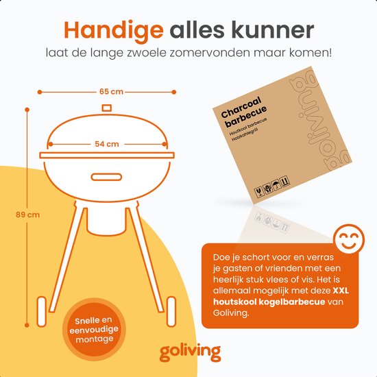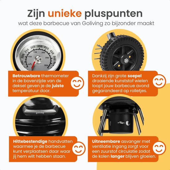 Barbecue au charbon de bois Goliving - Ø54 cm - Accessoires inclus - Barbecue au charbon de bois sur roues - BBQ XXL avec couvercle - Rond - 65 x 89 cm - Noir - Métal