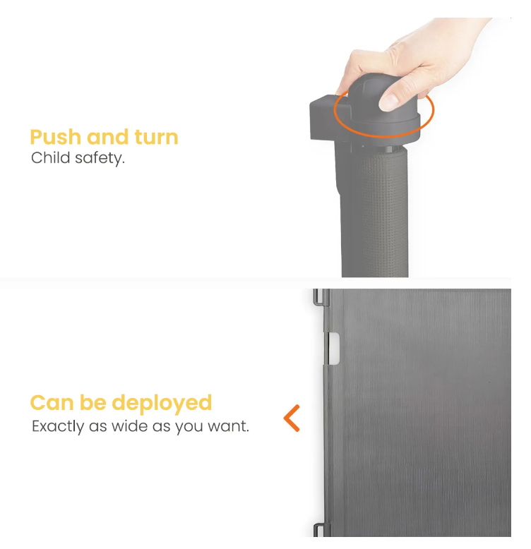 Barrière de sécurité enroulable - Goliving – Barrière pour enfants – Système Push & Turn – Largeur 10 à 150 cm – Cadre en aluminium – Maille grise