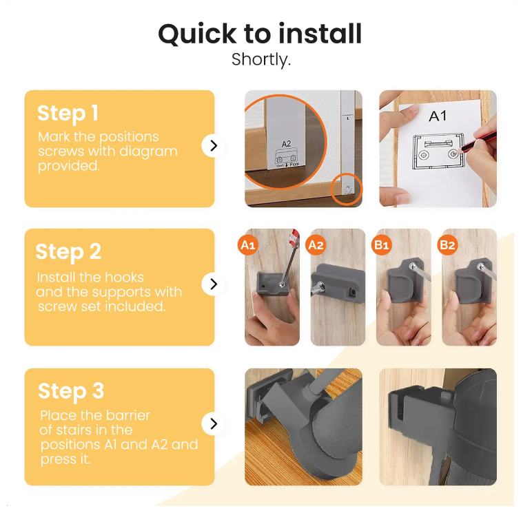 Installez votre barrière d'escalier enroulable en trois étapes simples grâce au jeu de vis et de chevilles inclus. Aucune connaissance technique n'est requise pour un montage rapide et facile.