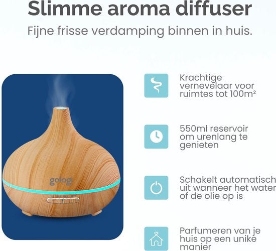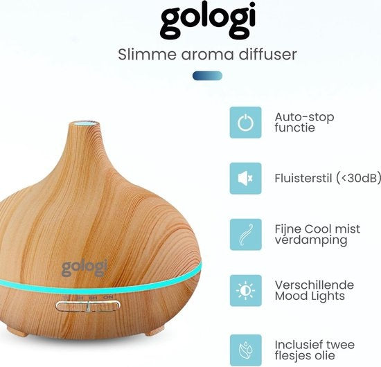 Gologi Smart Aroma Diffuser - 550ML - Humidificateur - Diffuseur de parfum - Eclairage LED - 2 huiles essentielles incluses - Marron clair
