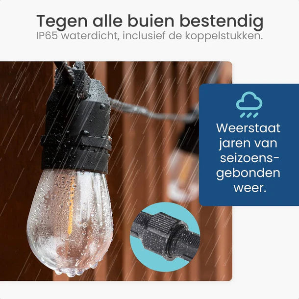 Cordon LED robuste et résistant à l'eauGrâce à son indice de protection IP65, la guirlande lumineuse Gologi est résistante à l'eau et à la poussière. Une forte pluie hollandaise n'est pas un problème pour les guirlandes lumineuses. Vous n'avez donc pas à vous inquiéter si vous voyez des nuages de pluie s'approcher au loin.