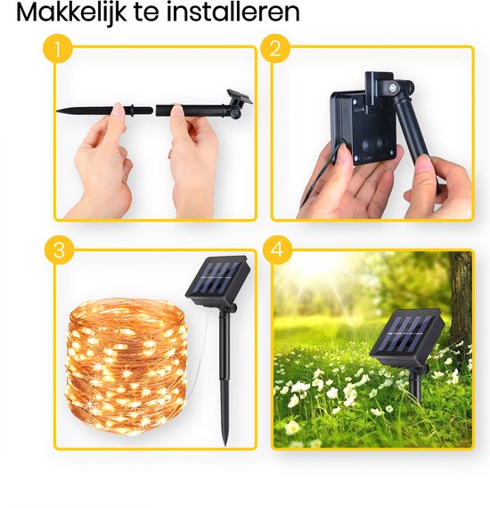 En plus d'être agréable, la guirlande lumineuse d'extérieur est également respectueuse de l'environnement. Positionnez le capteur solaire de manière à ce qu'il capte suffisamment de lumière du soleil pendant la journée et utilisez l'énergie solaire renouvelable sans dépendre du réseau électrique ou de longs câbles. Comme les lampes solaires de jardin sont parfaitement étanches, vous pouvez les laisser dehors les jours de pluie en toute tranquillité.n accrochez-les et profitez de l'ambiance des lampes solaires de jardin le soir !