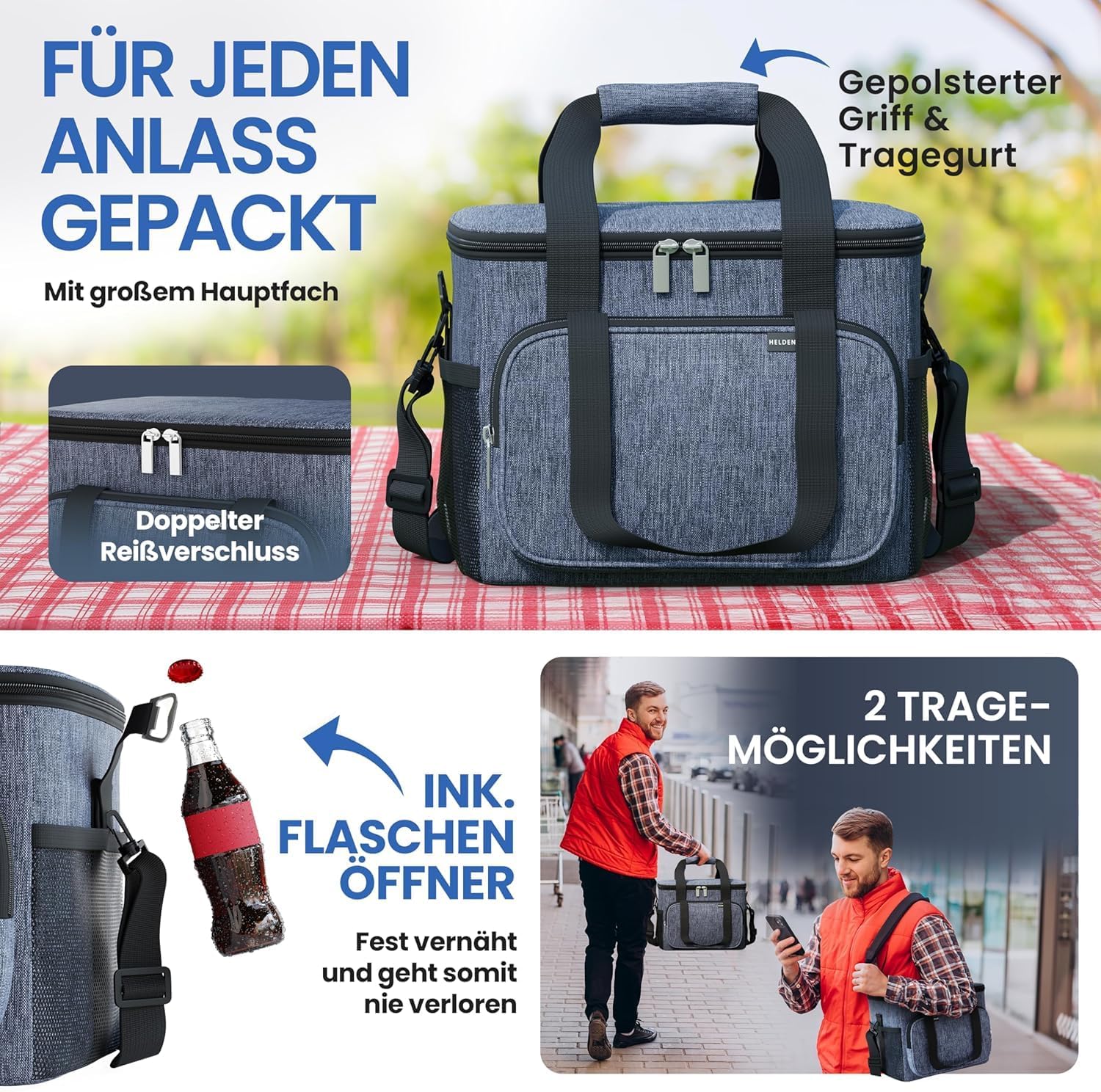 La conception pratique offre un maximum de commodité : une double fermeture à glissière, une poignée rembourrée, une sangle de transport réglable et un ouvre-bouteille robuste intégré assurent un transport facile et une fonctionnalité supplémentaire au quotidien.