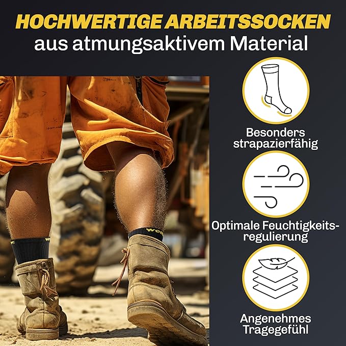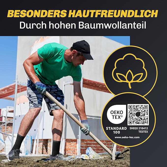 A propos de cet article Qualité industrielle : nos chaussettes de travail pour hommes sont composées d'un mélange de matériaux durables Tough Tex avec une forte teneur en coton, un talon et des orteils renforcés. Parfaites pour les applications difficiles au travail et dans la vie de tous les jours. NO SLIDING &ndash ; Grâce aux bandes élastiques spéciales WORK-FLEX, les chaussettes de travail reposent idéalement sur le pied, sans glisser ni se pincer. Elles offrent un maximum de stabilité et de confort. Parfaites pour les journées de travail longues et exigeantes. Régulation de la température et respirabilité : la technologie innovante Active Dry garantit des pieds secs et prévient les mauvaises odeurs. Les chaussettes sont respirantes et régulent la température. Parfaites pour une utilisation tout au long de l'année, elles ont été testées dans des conditions extrêmes. EXTRA DURABLE &ndash ; Grâce à la technologie DURA-REINFORCE aux points de charge, nos chaussettes de travail pour hommes sont particulièrement durables et durent trois fois plus longtemps que les chaussettes conventionnelles. Idéales pour les situations de travail exigeantes. Confort de port élevé et durabilité combinés. Confort tout au long de la journée : la maille HEXA avec doublure supplémentaire (tissu éponge) réduit la fatigue et assure un confort maximal. Les chaussettes de travail parfaites pour les chantiers, les ateliers et les loisirs.