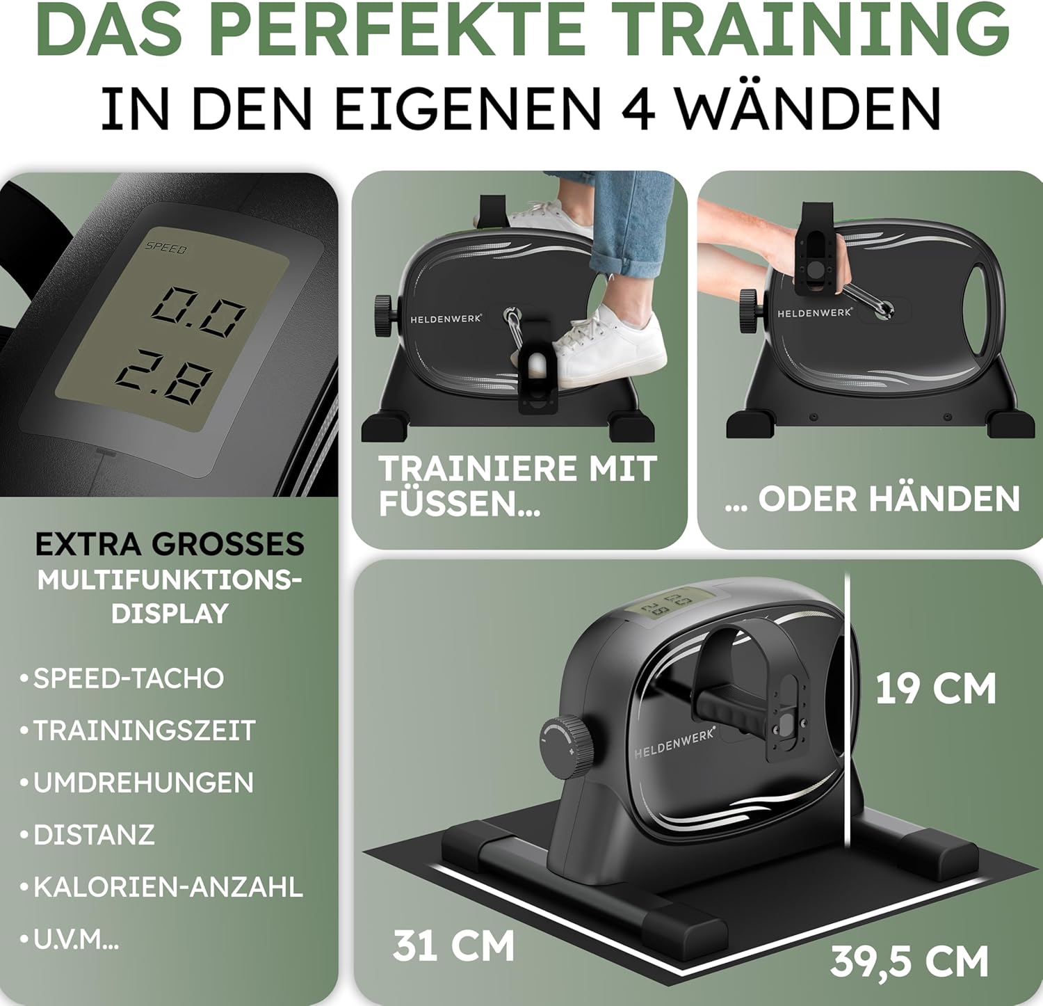 Le HELDENWORK pédalier est conçu pour une polyvalence maximale. Vous pouvez le placer sur le sol pour un entraînement efficace des jambes ou sur une table pour renforcer les muscles des bras. Ce faisant, l'appareil fournit une source constante d'exercices pour l'ensemble du corps. Grâce au bouton de résistance réglable en continu, vous décidez de l'intensité de votre entraînement, qu'il s'agisse d'un exercice léger ou d'un exercice cardio plus difficile. L'affichage numérique vous informe avec précision du nombre de tours, de la durée et de la consommation de calories.
