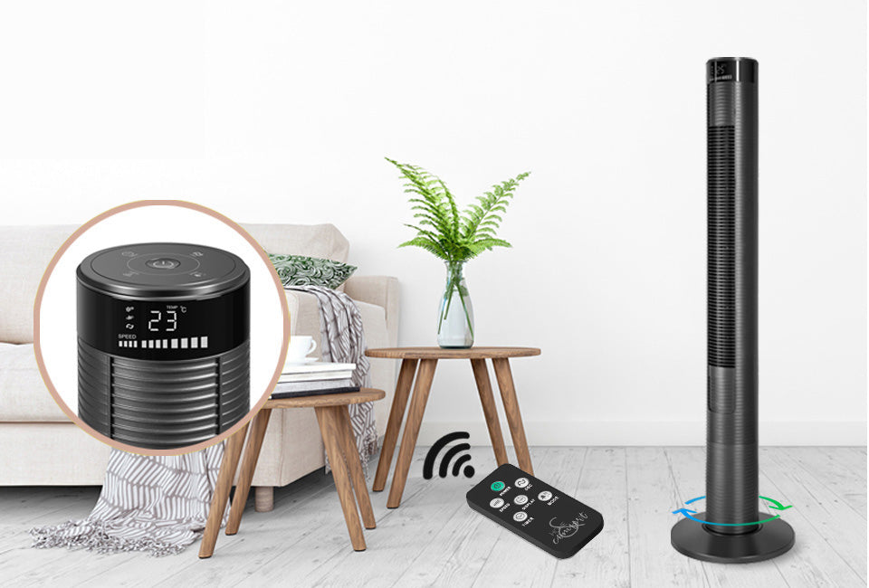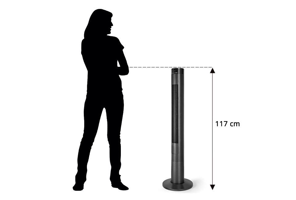 Grâce à son design de tour verticale, ce ventilateur prend peu de place et peut donc être placé n'importe où dans la maison. De plus, avec ses 117 cm, il est plus grand que la plupart des ventilateurs à tour, ce qui assure un refroidissement supplémentaire.