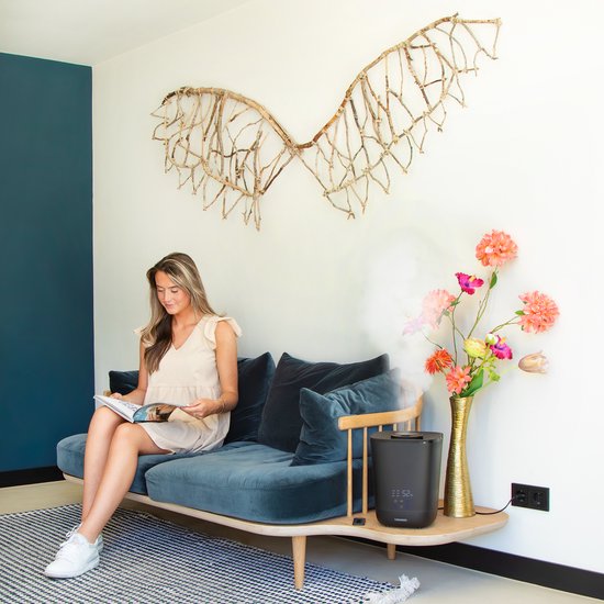 Il s'agit d'un humidificateur à ultrasons, ce qui signifie que l'eau est pulvérisée par des vibrations à haute fréquence. Il s'agit d'une procédure silencieuse, sans vapeur et rapide ; dès que vous mettez l'appareil en marche, vous constatez des résultats immédiats. L'eau étant pulvérisée à froid - et ne nécessitant donc pas de vapeur - elle est sûre et économe en énergie. De plus, l'eau est stérilisée par la lampe UV intégrée, ce qui garantit une atomisation très propre.
