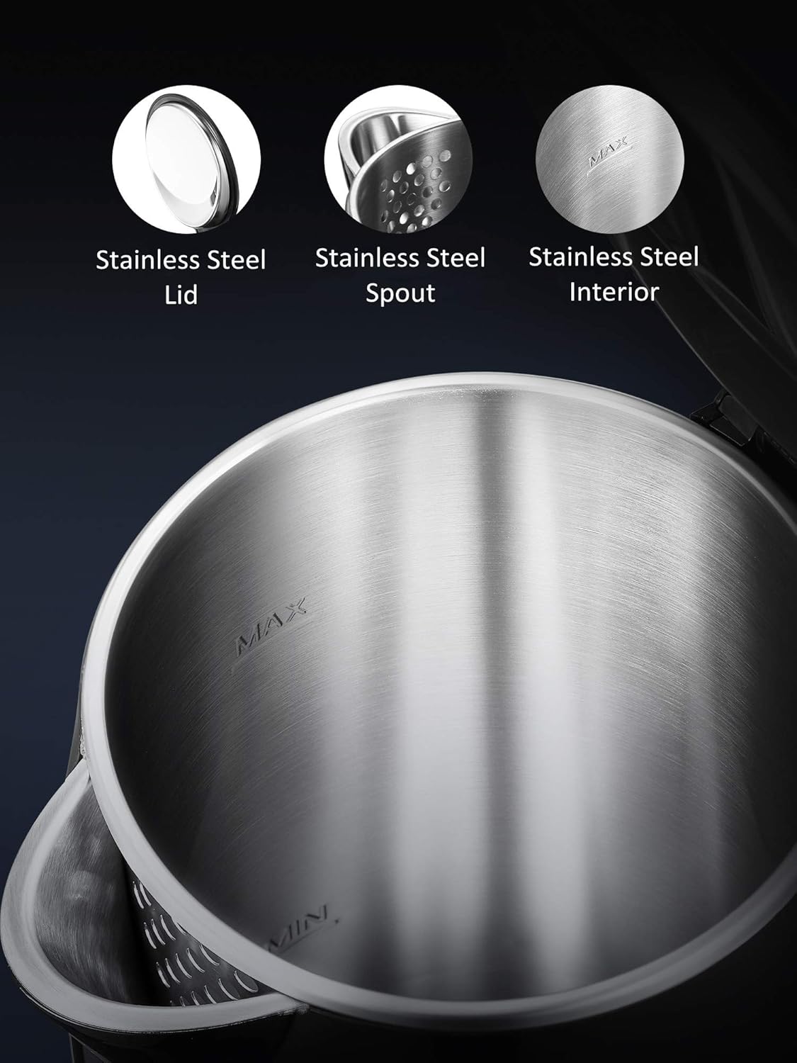 Grâce à la protection intégrée contre l'ébullition à sec, vous pouvez être sûr que la bouilloire s'arrêtera lorsqu'elle menacera de s'assécher. Cela garantit une utilisation en toute sécurité. En outre, la bouilloire est dotée d'une double paroi isolée, ce qui rend la fonction de chauffage extrêmement efficace sur le plan énergétique. L'intérieur en acier inoxydable garantit que l'eau reste toujours pure, a une longue durée de vie, est compatible avec le BPA et les aliments, et la bouilloire est facile à nettoyer.