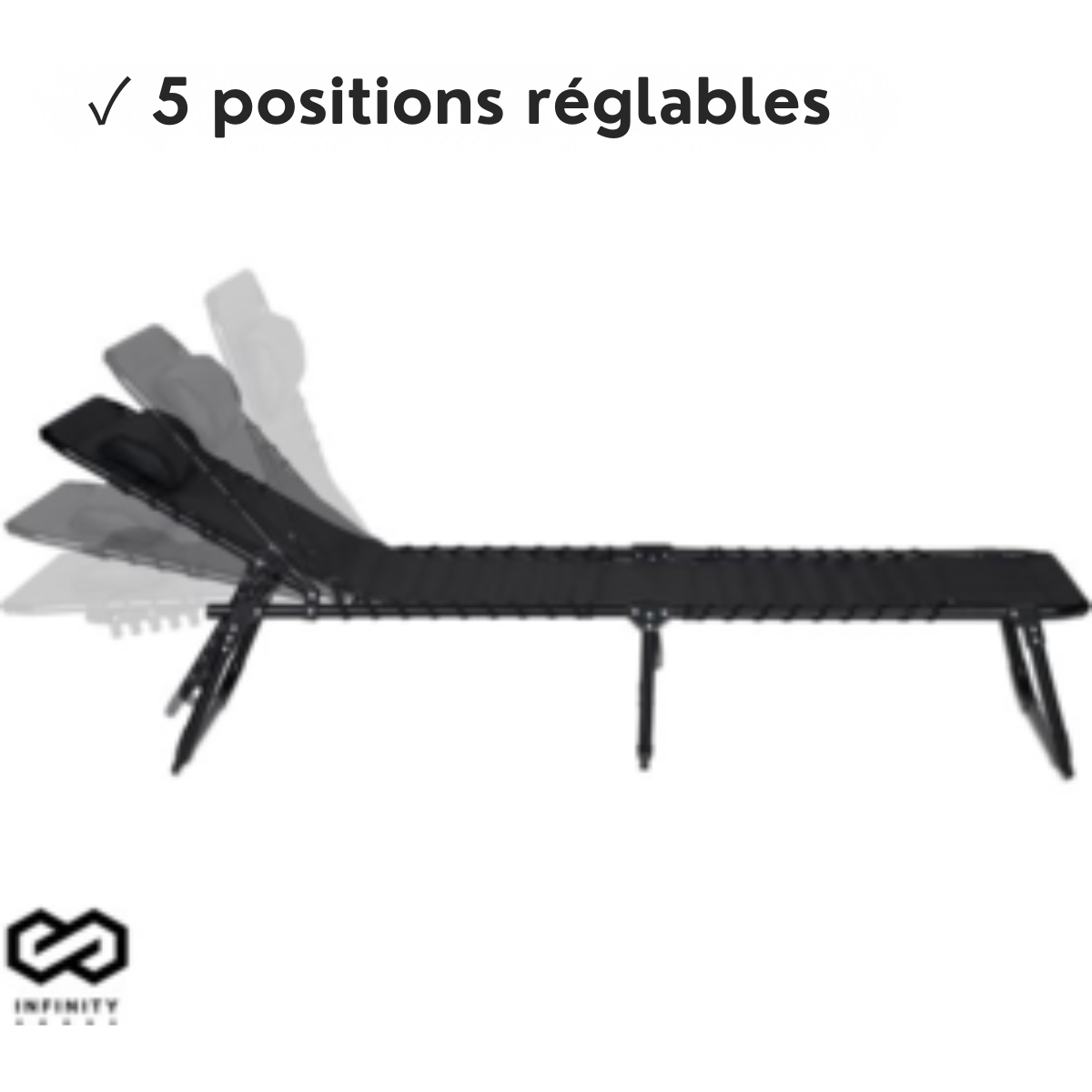 Profitez du soleil et de la détente partout avec la chaise longue pliable Infinity Goods, idéale pour le jardin, le balcon, la piscine, le camping ou la plage. Légère (6 kg) et compacte, elle se plie facilement pour être transportée ou rangée sans effort.