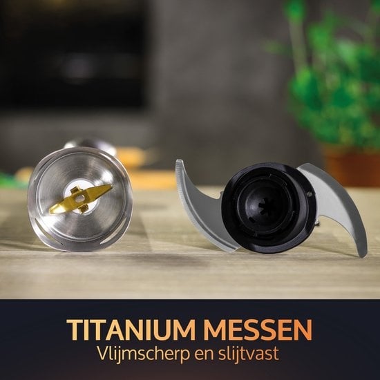 Gagnez du temps et de l'énergie en transformant les ingrédients à la main. Les lames en titane innovantes et tranchantes comme des rasoirs mélangent et broient avec des résultats professionnels. La lame ne traite pas seulement les ingrédients très rapidement et minutieusement, mais aussi de manière régulière et avec soin.