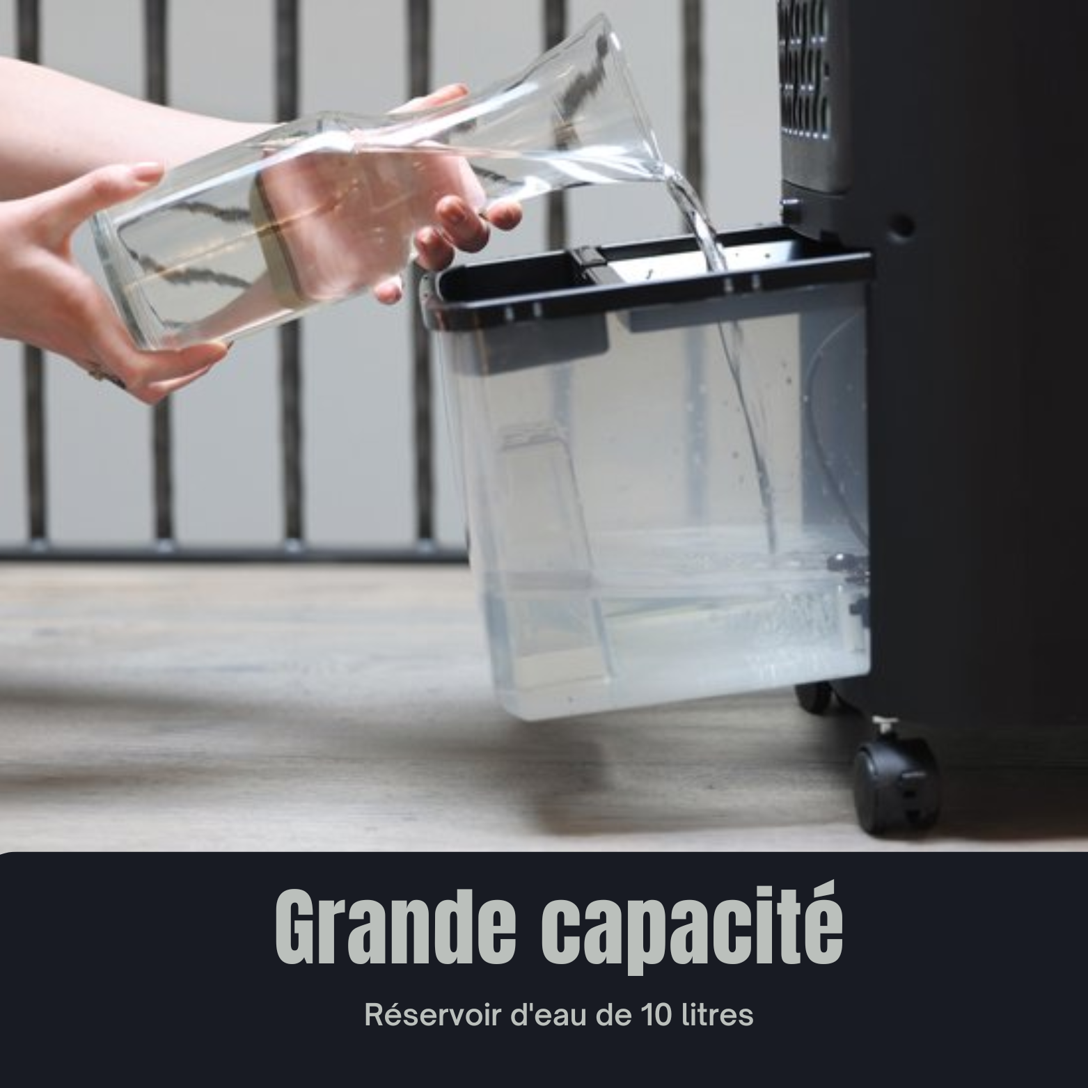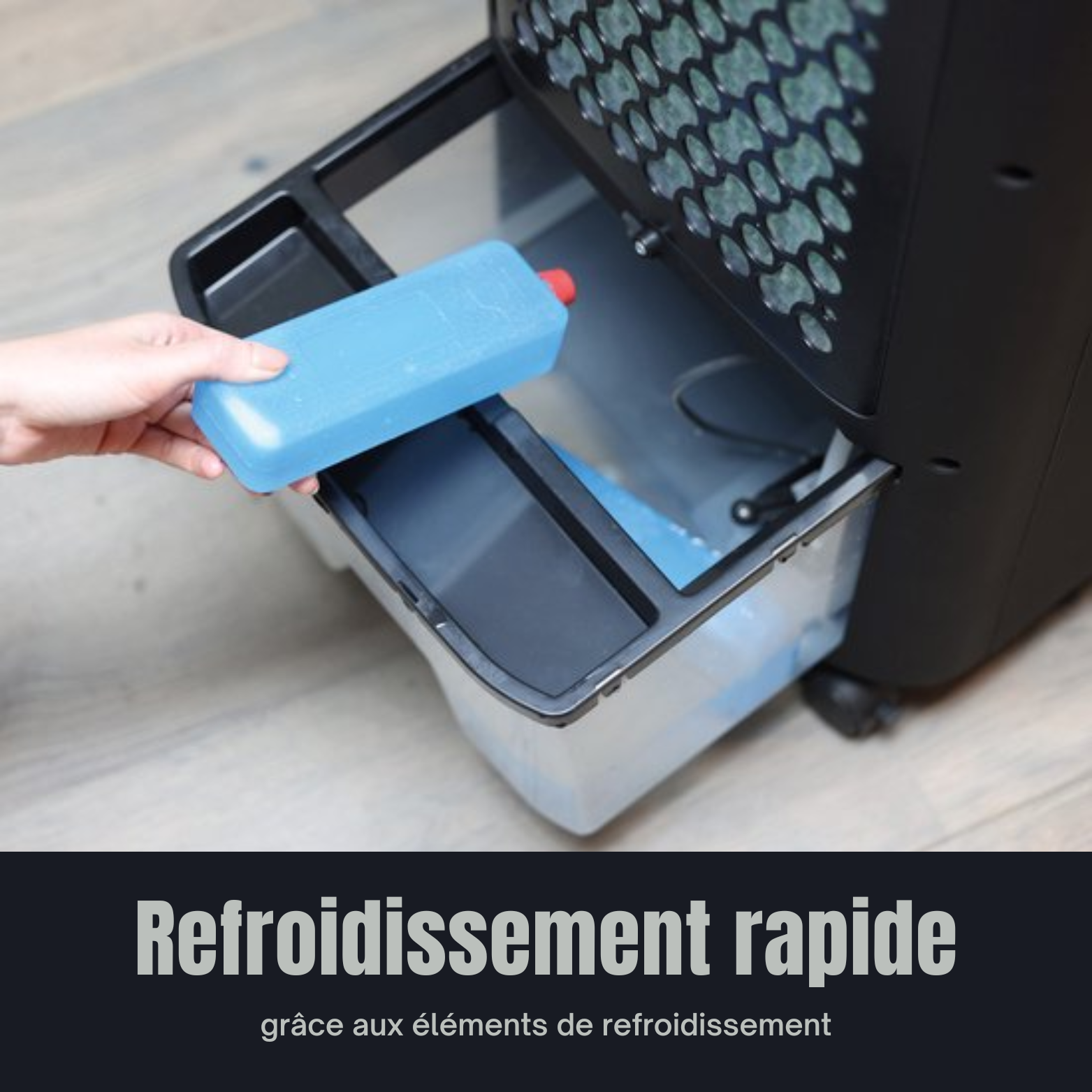 L'eau passe à travers le refroidisseur d'air. Cela permet au refroidisseur d'air de distribuer de l'air plus froid. Plus l'eau est froide, plus l'air est froid. Le refroidisseur d'air est équipé d'un grand réservoir d'eau de 10 litres, ce qui vous permet d'utiliser le refroidisseur d'air plus longtemps. Vous pouvez également ajouter des arômes à l'eau.