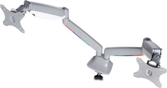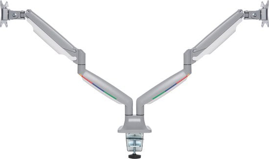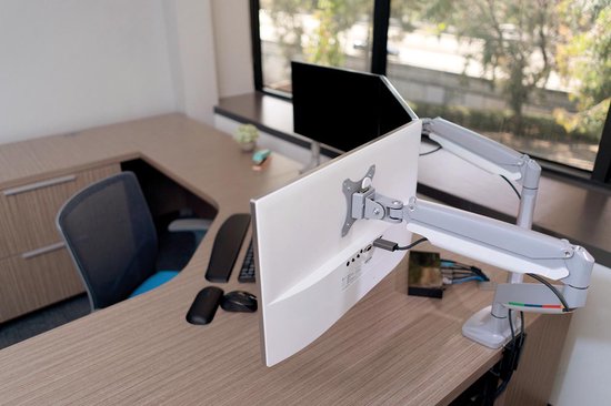 - Les bras à double moniteur permettent un pivotement et une rotation du moniteur à 180°, avec une inclinaison de +/- 90°, et permettent aux moniteurs de se déplacer sans effort vers le haut, le bas, l'avant et l'arrière, assurant une totale liberté de mouvement.
