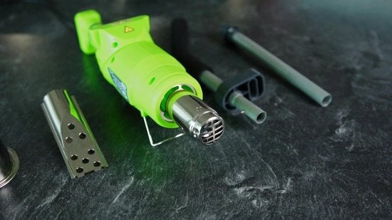 Avec les buses incluses, vous déterminez davantage la fonction. La poignée rotative et le support rabattable sont également pratiques lorsque vous n'utilisez pas l'appareil pendant un certain temps. Le brûleur de mauvaises herbes dispose de deux niveaux de chauffe. Le réglage 1 est d'environ 80°C, le réglage 2 est beaucoup plus élevé : environ 360°C.