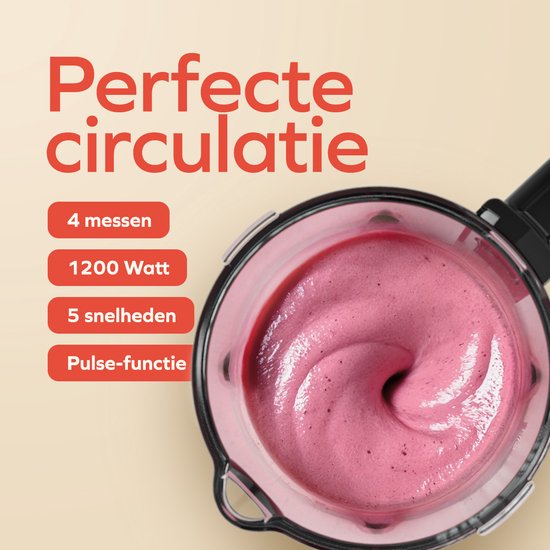 Avec un puissant moteur de 1200W, ce blender peut traiter tous les ingrédients sans effort. Que vous utilisiez des fruits congelés pour votre smoothie, des noix pour votre pâte de noix maison ou des légumes pour une soupe crémeuse, ce moteur a suffisamment de puissance pour tout mixer parfaitement. Grâce à sa construction robuste, le moteur ne surchauffe pas, même en cas d'utilisation prolongée. Le blender convient donc parfaitement aux recettes nécessitant un temps de mixage plus long, comme une soupe parfaitement lisse ou un milk-shake... crémeux.