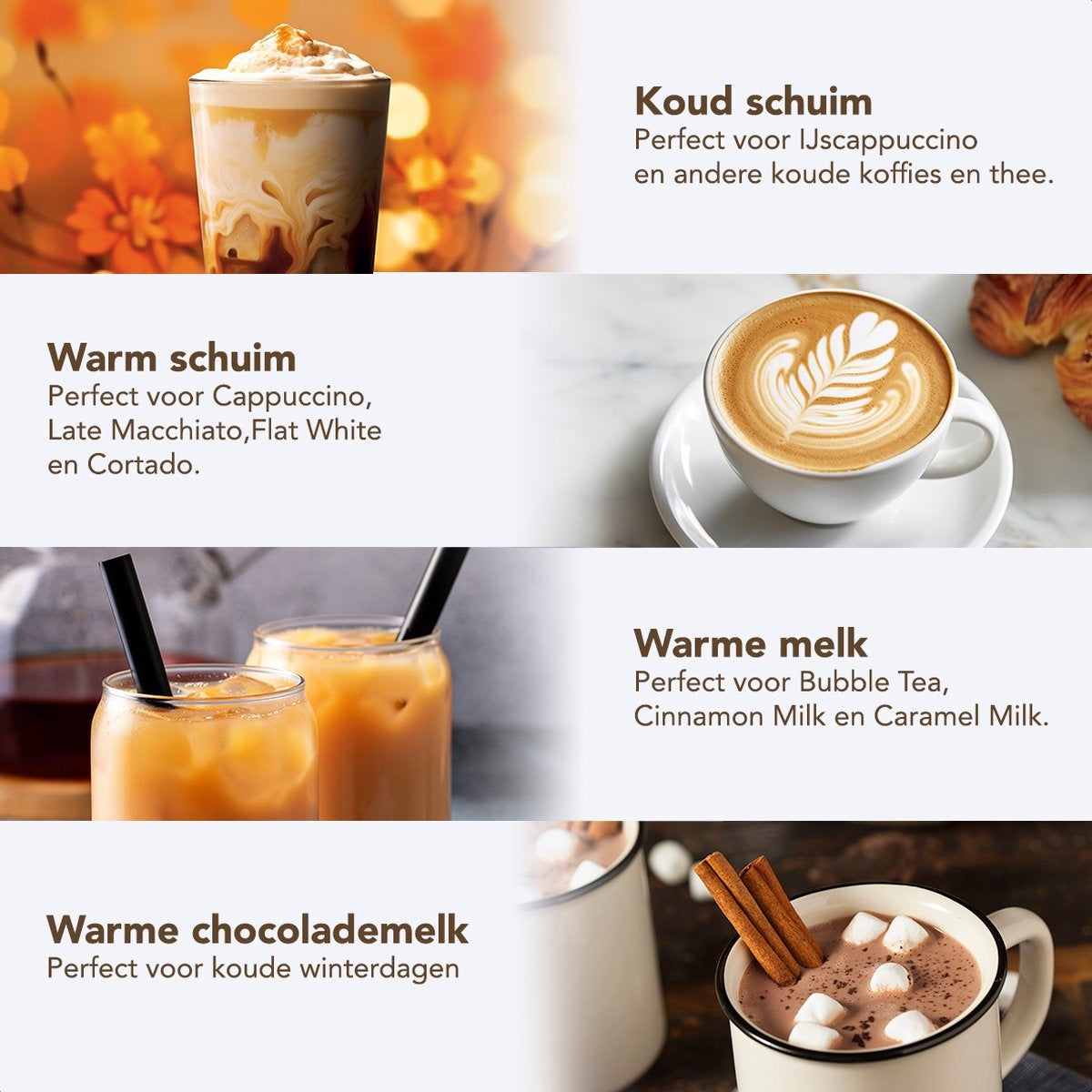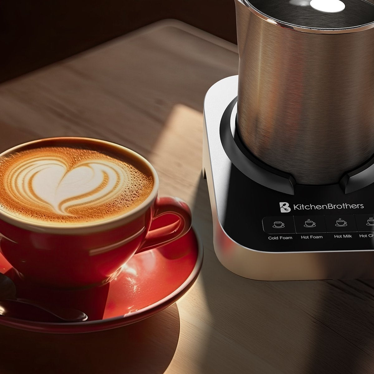 Un cappuccino sur le balcon le matin ou un délicieux café au lait au déjeuner ? Un café glacé rafraîchissant par un jour d'été ou simplement un chocolat chaud par une soirée d'hiver glaciale ? Avec le chauffe-lait KitchenBrothers, tout cela est possible.