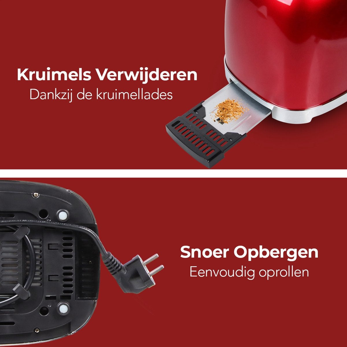 Tout le monde aime avoir une cuisine bien rangée pour commencer la journée. Le grille-pain de KitchenBrothers est conçu pour laisser votre cuisine aussi ordonnée que possible. Par exemple, vous pouvez ranger le cordon d'alimentation sous le grille-pain. Vous trouverez également deux plateaux ramasse-miettes amovibles très pratiques. Un appareil propre et bien rangé !