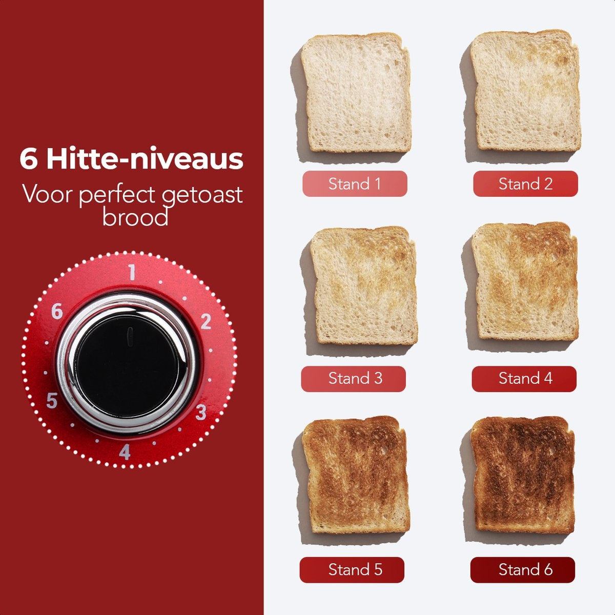 Vous aimez les toasts très clairs ? Ou plutôt les toasts très foncés ? Avec le grille-pain de KitchenBrothers, vous avez l'embarras du choix. Vous avez le choix entre six réglages de chaleur différents :