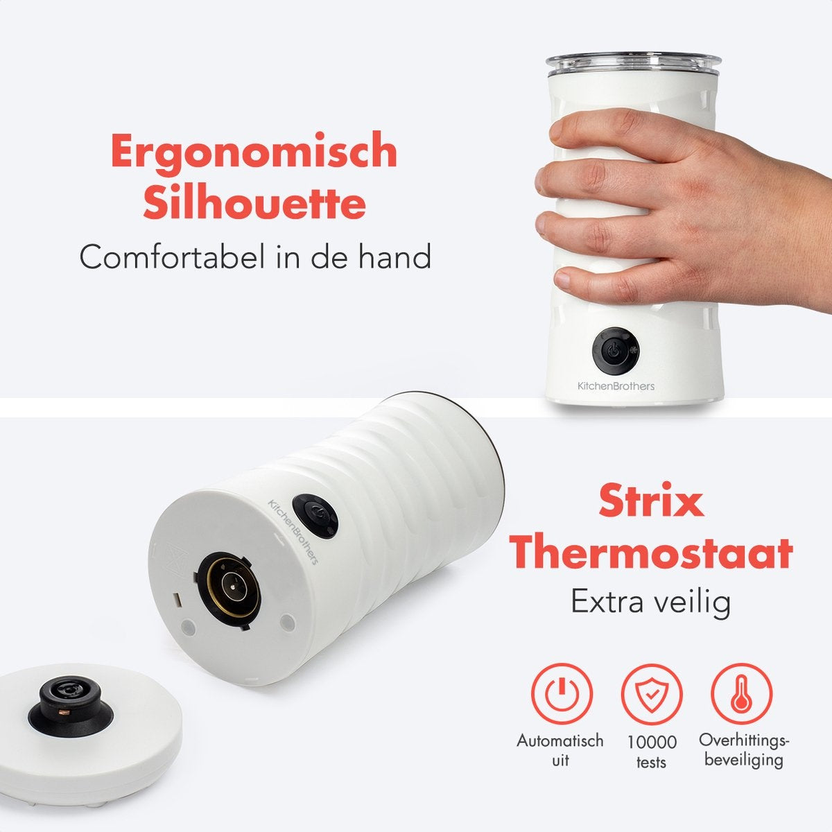 Pour un cappuccino réussi, le lait doit être à la bonne température. Le mousseur à lait KitchenBrothers est protégé contre la surchauffe et s'éteint automatiquement dès que le lait atteint 65 °C. Vous n'avez donc pas à vous soucier d'un lait trop chaud.