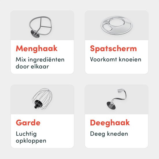 Ce robot de cuisine, équipé d'un fouet et d'un crochet pétrisseur, est un véritable multitâche. Chaque accessoire a sa fonction spécifique : le crochet mélangeur est parfait pour les pâtes et les purées, le fouet pour les mousses aériennes et la crème fouettée, et le crochet pétrisseur pour les pâtes plus lourdes. Ce robot polyvalent avec bol mélangeur facilite l'entretien, car tous les accessoires passent au lave-vaisselle.