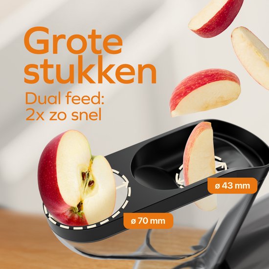 Le KitchenBrothers Slowjuicer XL se distingue par son système innovant d'alimentation double. Cela indique Avec cet extracteur de jus, vous avez le choix entre deux options d'alimentation : une large ouverture de 70 mm, idéale pour les gros morceaux de fruits et de légumes, et une ouverture plus compacte de 43 mm, parfaite pour les ingrédients plus petits tels que les baies ou le raisin. Cela signifie que vous passez moins de temps à couper les ingrédients, ce qui vous permet de gagner un temps précieux lors de la préparation. Que vous souhaitiez presser une pomme entière ou une poignée de carottes, cet extracteur de jus vous permet de préparer rapidement et efficacement des jus frais. Grâce aux deux ouvertures différentes, vous travaillez deux fois plus vite qu'avec un système Sigle Feed traditionnel.