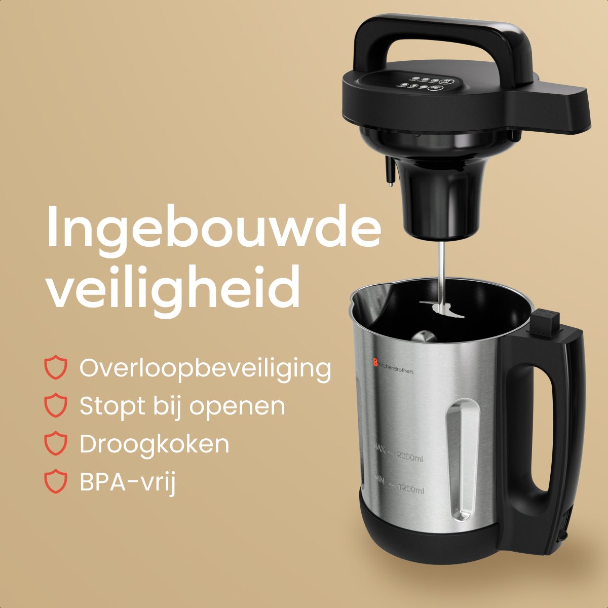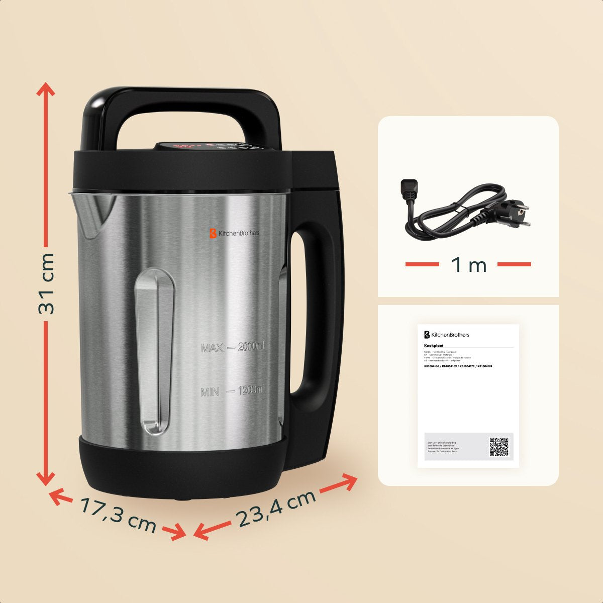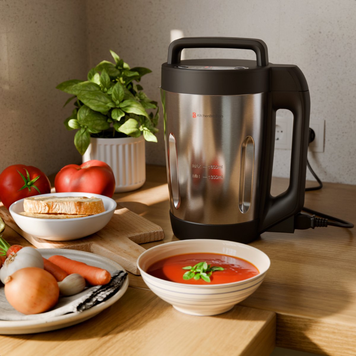 L'appareil à soupe KitchenBrothers est équipé d'une protection ébullition-assèchement et d'un capteur pour éviter la surcuisson. Vous pouvez donc préparer vos plats en toute sérénité. L'appareil est sans BPA et dispose d'un cordon extra-long de 100 cm pour plus de commodité dans la cuisine.