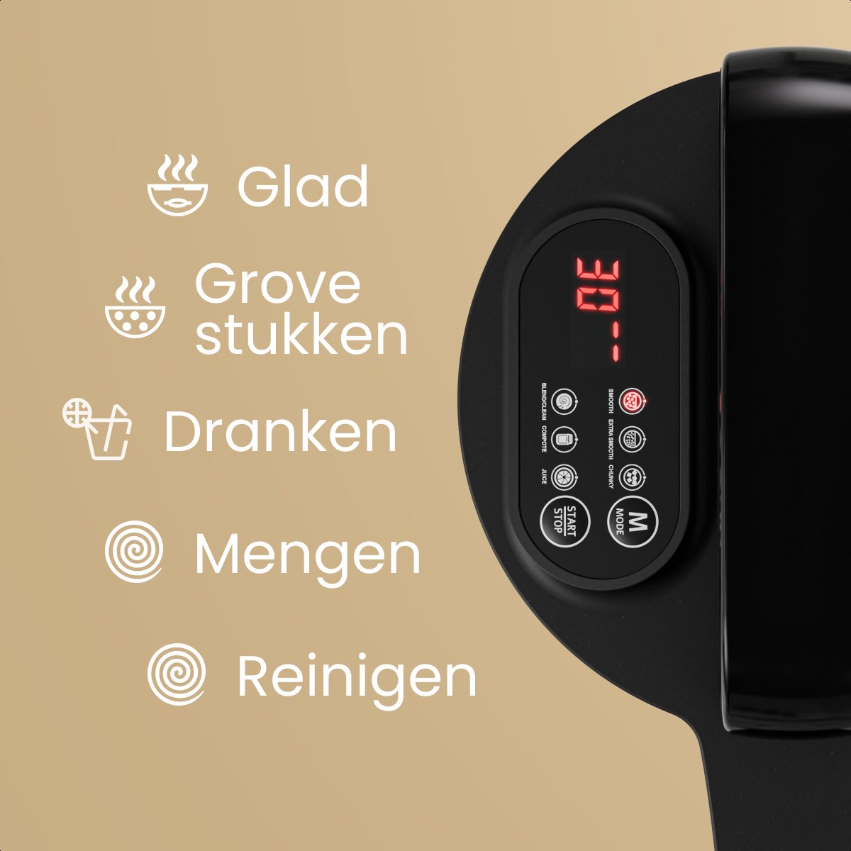L'écran LCD avec compte à rebours vous donne un aperçu clair de l'avancement de vos plats. Le puissant préparateur de soupe dispose de cinq fonctions pratiques : Lisse, Chunky, Boissons, Mixer et Nettoyer. Ces fonctions vous permettent de préparer des soupes lisses ou en morceaux, de délicieux smoothies et milkshakes, et de nettoyer l'appareil en toute simplicité.