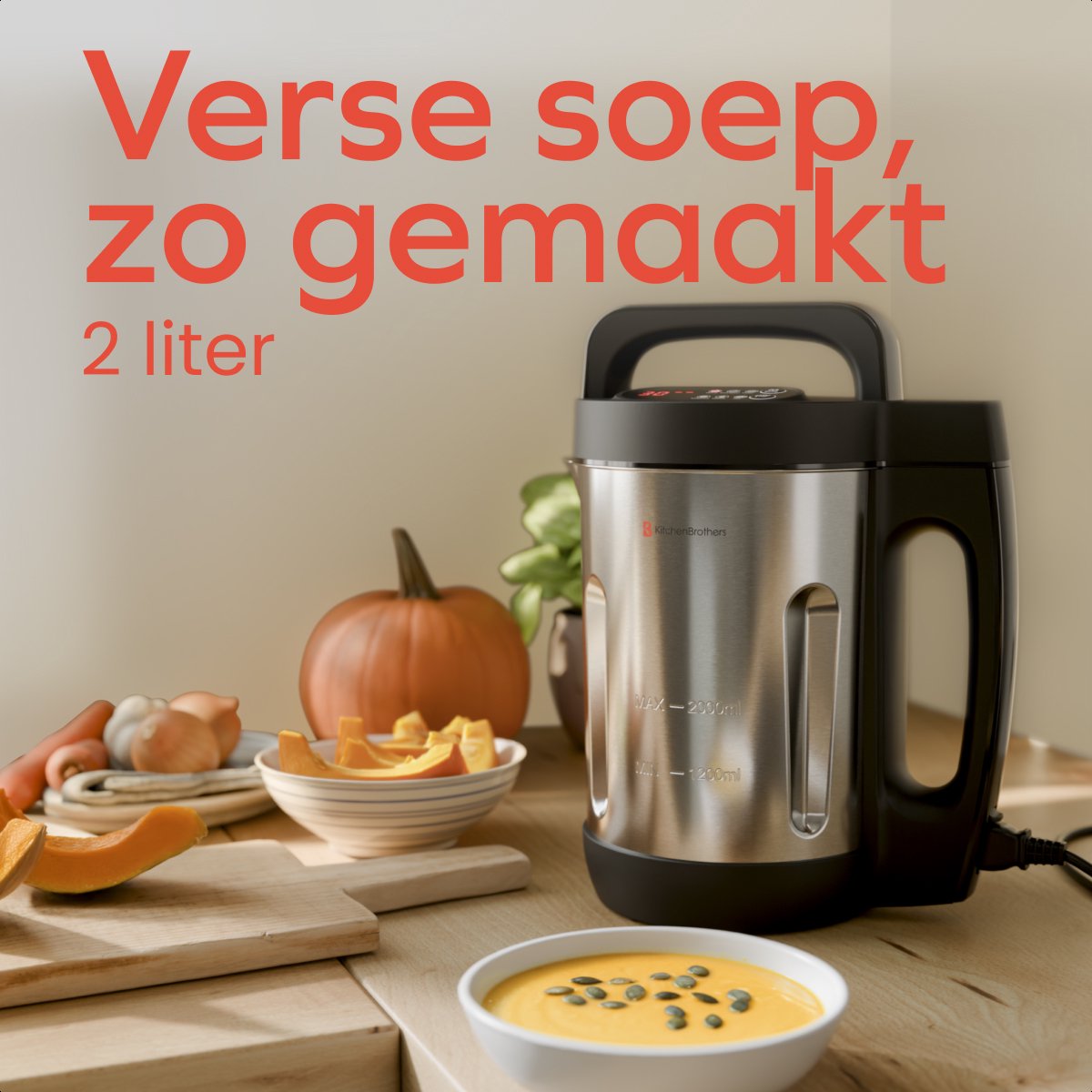 L'appareil à soupe KitchenBrothers, d'un prix abordable, a une capacité allant jusqu'à 2 litres. Il est équipé d'un moteur puissant et d'un élément chauffant, de sorte que vos soupes et boissons seront préparées rapidement et parfaitement.