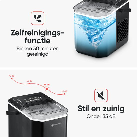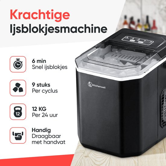 Kitchenwell Machine à glaçons - 1.3L - Machine à glaçons avec cuillère à glace - 12kg/24 heures - Fonction auto-nettoyante - Portable - Noir