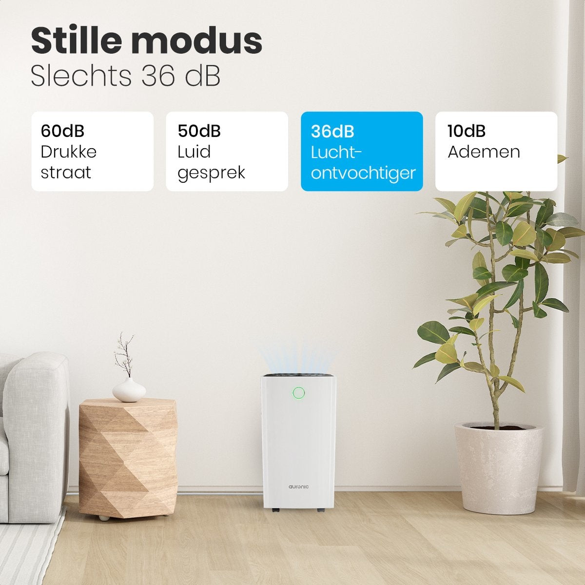 Avec une capacité de 12 litres par jour et une capacité de déshumidification de l'air de 100 m³ par heure, le déshumidificateur Auronic garantit que vos pièces sont rapidement débarrassées de l'humidité. Le réservoir d'eau de 2 litres permet de capturer largement l'humidité extraite, de sorte que vous n'avez pas à le remplir aussi souvent.