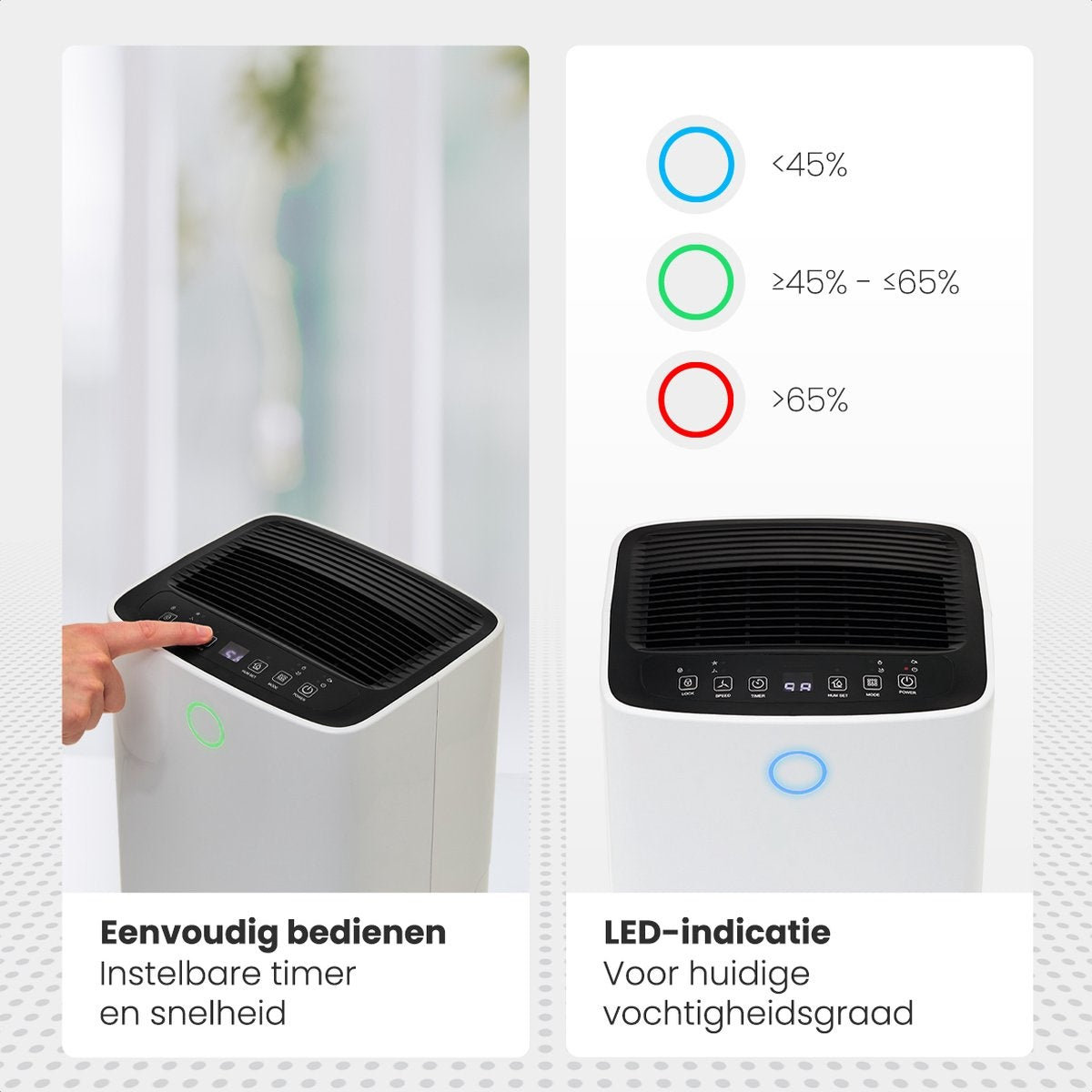 Grâce au indicateur LED, vous pouvez facilement contrôler le niveau d'humidité de votre pièce. Le déshumidificateur indique avec le vert, le jaune et le rouge si l'humidité est au bon niveau. Le vert signifie que l'humidité est optimale, le jaune indique qu'il est temps de déshumidifier et le rouge avertit d'un excès d'humidité. Les réglages intelligents facilitent l'utilisation du déshumidificateur grâce aux boutons et à la fonction minuterie.