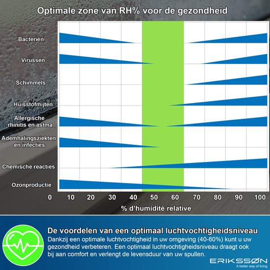 Ce déshumidificateur est puissant, économe en énergie et a un niveau sonore de 45 dB, ce qui en fait le déshumidificateur compact le plus silencieux et le plus puissant du marché néerlandais. Le déshumidificateur d'air Dry Pro Plus 20L d'Erikssøn peut déshumidifier jusqu'à 175 m³ d'air par heure.