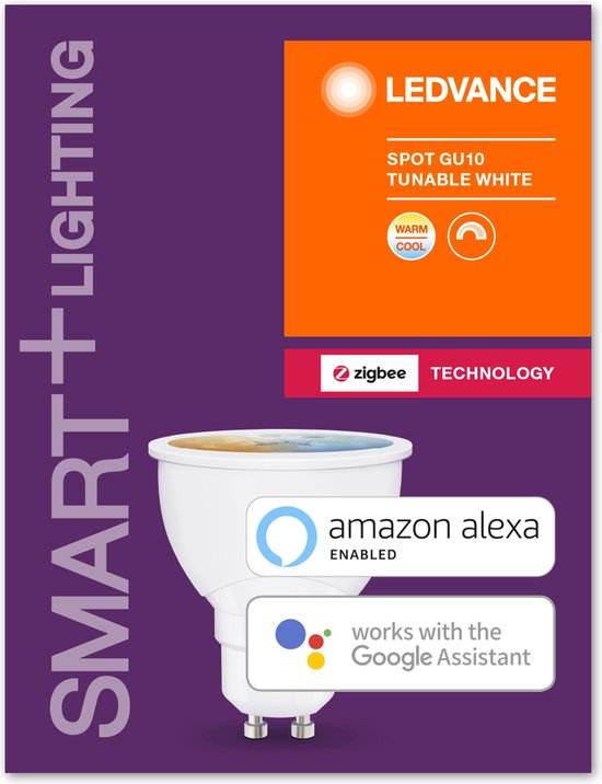 Spot PAR16 avec technologie ZigBee. Caractéristiques du produit : Lampe LED PAR 16 avec option d'éclairage intelligent intégrée. Couleur de lumière réglable avec Tunable White : du blanc chaud à la lumière du jour (2700K-6500K). Possibilité de gradation. Protocole réseau : ZigBee. Durée de vie : jusqu'à 20 000 heures. Contrôlable via un système domestique intelligent compatible (passerelle et appli) ou l'interrupteur SMART+. La fonctionnalité complète nécessite une connexion à un système domestique intelligent compatible (passerelle et appli). Avantages du produit : jusqu'à 80 % de consommation d'énergie en moins par rapport aux lampes halogènes. Facile à installer et à utiliser. Sans mercure. Domaines d'application : Éclairage général. Utilisation en extérieur uniquement dans des luminaires adaptés. Caractéristiques techniques : Le contrôle via l'app nécessite le système LIGHTIFY (app et passerelle) ou un autre système Smart Home adapté.