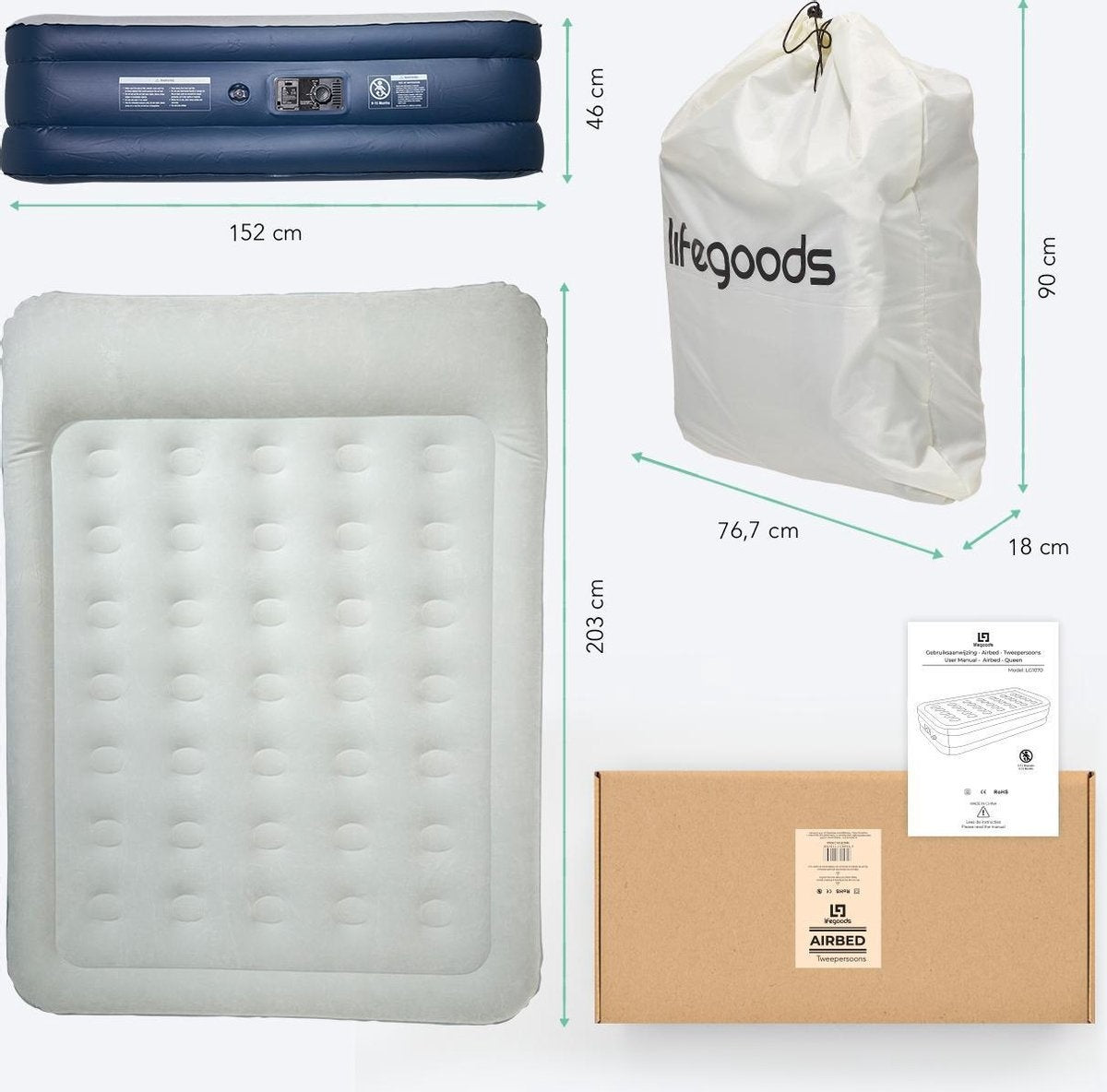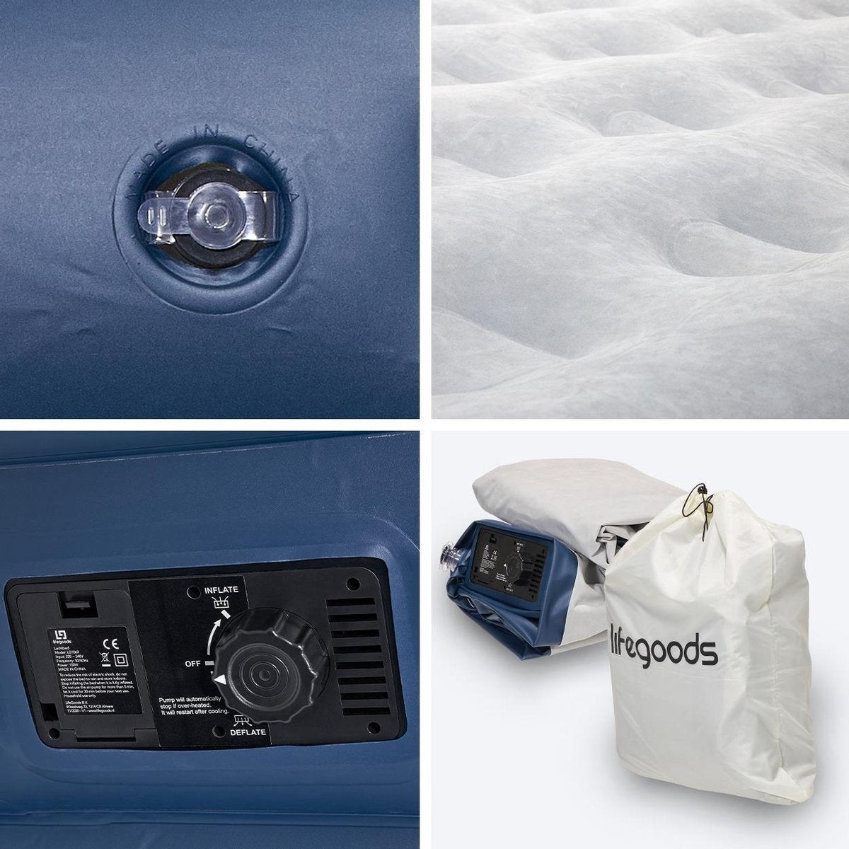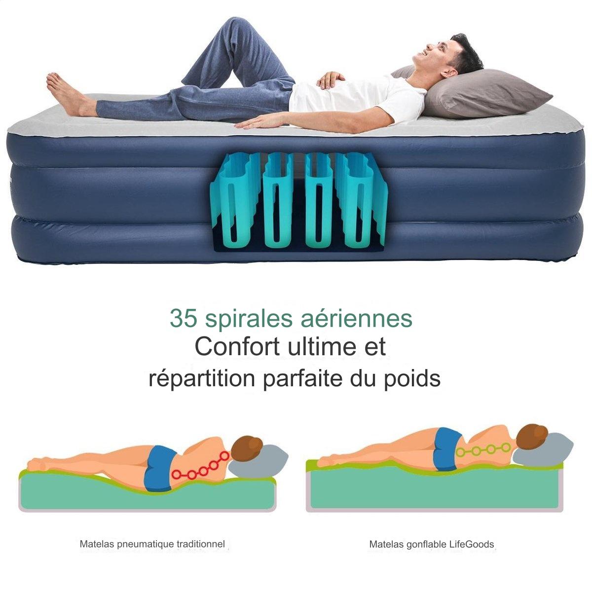 Lit gonflable LifeGoods - 2 personnes - Avec pompe intégrée - Sac de transport et kit de réparation inclus - Bleu
