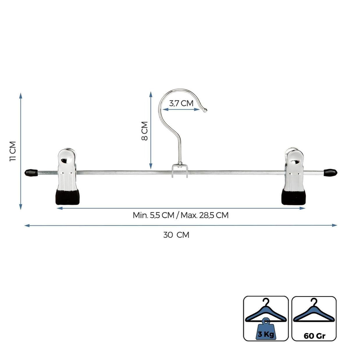 Les cintres sont équipés de puissantes pinces réglables d'une capacité de charge de 3 kg. Vous pouvez facilement régler les pinces en largeur. Vous pouvez les placer dans le sens de la largeur ou de l'étroitesse, jusqu'à un centimètre d'écart. Vous pouvez donc facilement adapter le cintre à n'importe quel vêtement ou type de textile.