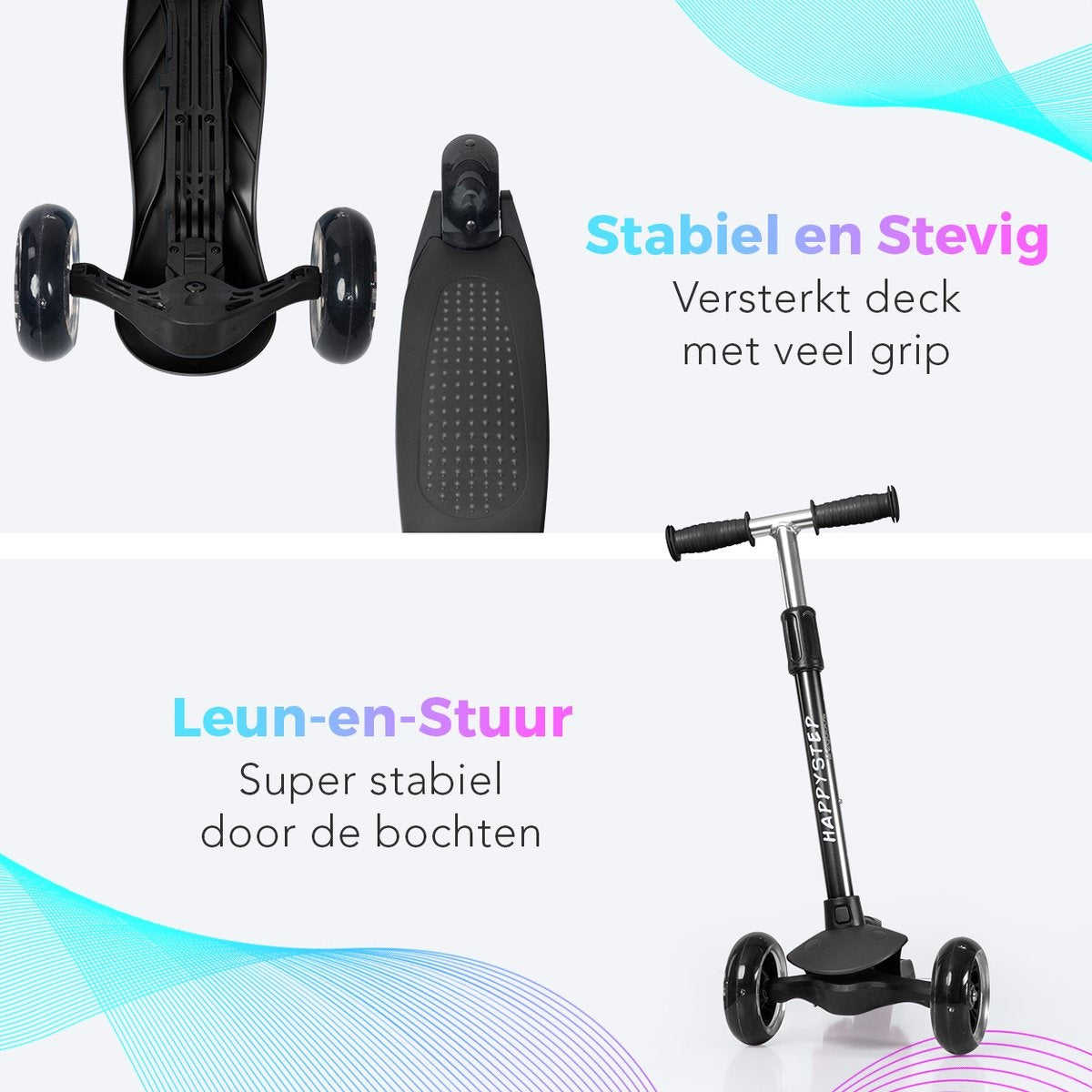 Équipée d'un cadre en aluminium solide et de 3 roues en PU (85A avec roulements ABEC 5), cette trottinette offre une grande stabilité grâce à ses deux roues avant et une roue arrière. Les roues sont dotées de lumières LED qui s'allument en tournant, rendant la trottinette amusante et visible.