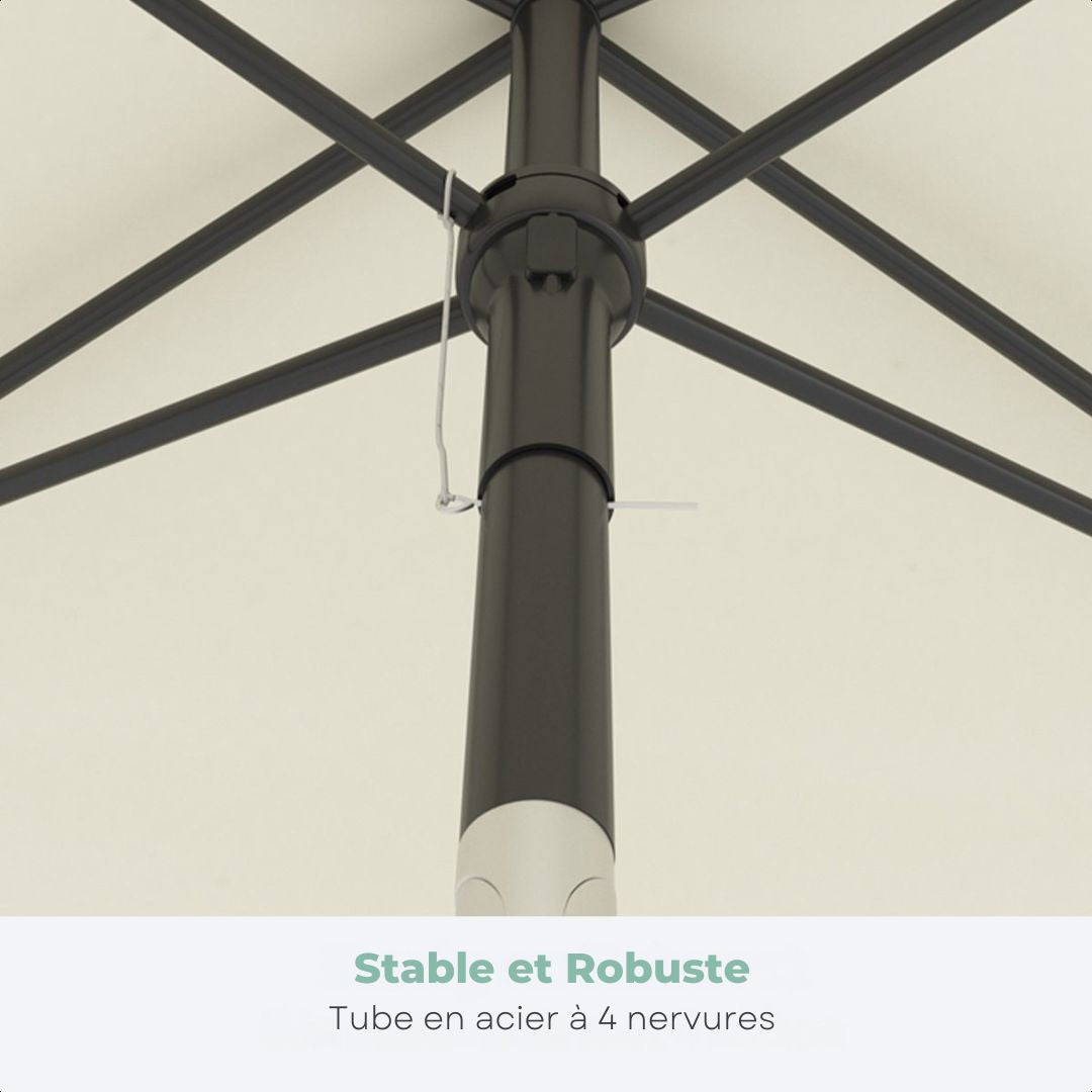 La structure repose sur un mât métallique robuste avec articulation en aluminium résistante à la corrosion. Les quatre baleines métalliques assurent une excellente tension de la toile et une stabilité optimale. Le parasol est inclinable jusqu’à 30° afin de suivre la course du soleil et réglable en hauteur de 175 à 235 cm grâce à un bouton rotatif simple et fiable. Une housse imperméable est incluse pour faciliter le rangement et le transport.
