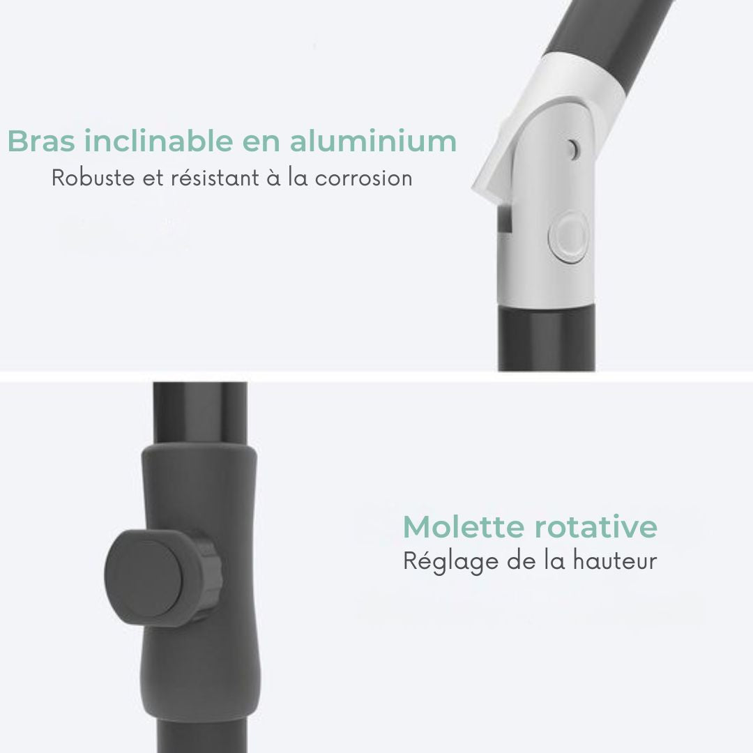 Base de parasol non incluse. Compatible avec une base de 38 à 42 mm, poids minimum recommandé : 10 kg.