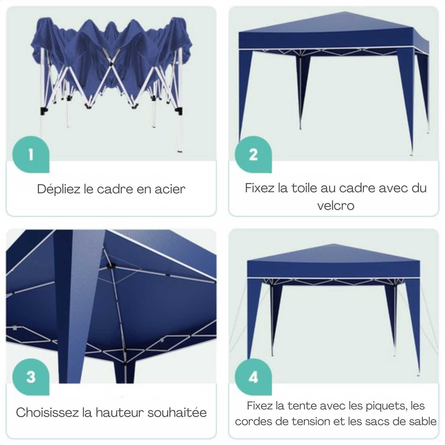 L'armature intégrée de la tente de réception est de type harmonica pliable. Il n'est pas nécessaire d'assembler la tente de réception. En quelques minutes, la tente est prête à l'emploi ! Grâce à cette conception pop-up, vous n'avez pas besoin de cliquer sur les pieds pour les mettre en place.
