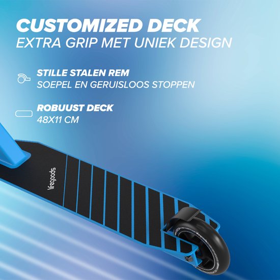 La maîtrise et la vitesse sont cruciales pour l'apprentissage des figures. Cette trottinette cascadeuse combine un large guidon (50 cm) avec des poignées antidérapantes pour une prise en main et une stabilité optimales. Le pont généreux (48x11 cm) offre une base solide pour vos pieds, tandis que les roues en PU de 100 mm avec un noyau en aluminium solide et des roulements ABEC-9 de haute qualité garantissent une conduite souple et rapide. Pesant seulement 3,4 kg, la trottinette est assez légère pour les mouvements rapides comme les bunny hops, ce qui vous permet de conquérir le skate park en toute confiance.
