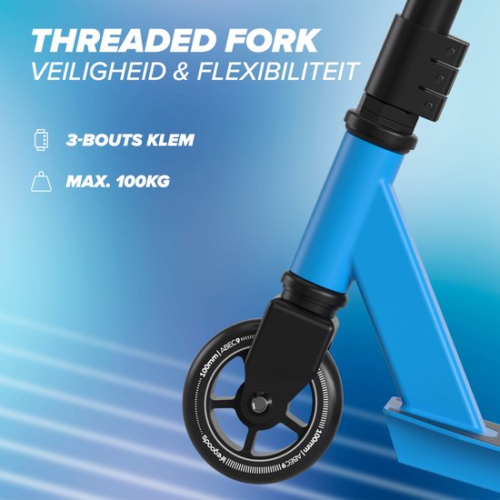 Sécurité et durabilité vont de pair. Cette trottinette est conçue pour résister aux chocs grâce à sa barre en Y en aluminium et à son tablier robuste. Le guidon est solidement fixé à l'aide d'une pince fiable à 3 boulons, ce qui offre une stabilité supplémentaire lors des cascades. Lorsque vous devez freiner, vous pouvez vous arrêter rapidement et avec contrôle grâce au frein arrière efficace. Grâce à cette construction robuste, la trottinette a une capacité de charge maximale de 100 kg et est prête pour une utilisation intensive.