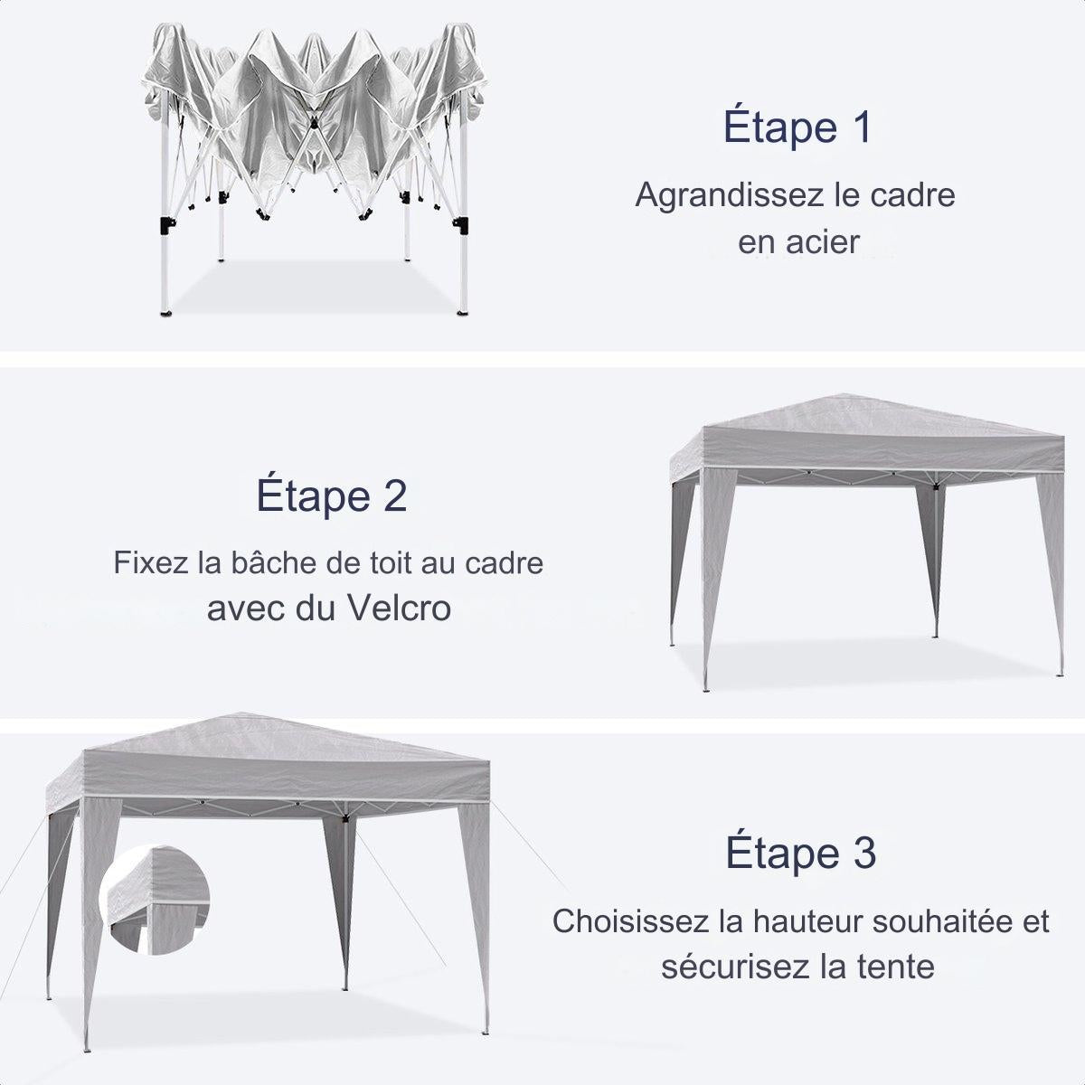 L'armature intégrée de la tente de réception est de type harmonica pliable. Il n'est pas nécessaire d'assembler la tente de réception. En quelques minutes, la tente est prête à l'emploi ! Grâce à cette conception pop-up, vous n'avez pas besoin de cliquer sur les pieds pour les mettre en place.