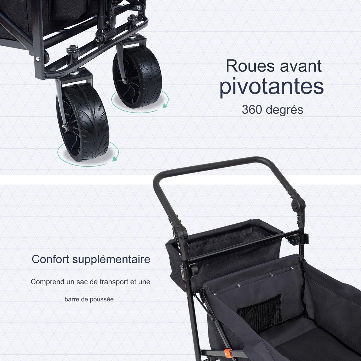 Doté d’un frein intégré, le chariot offre une utilisation sécurisée même sur des pentes. Notez qu’il n’est pas destiné au transport d’enfants.